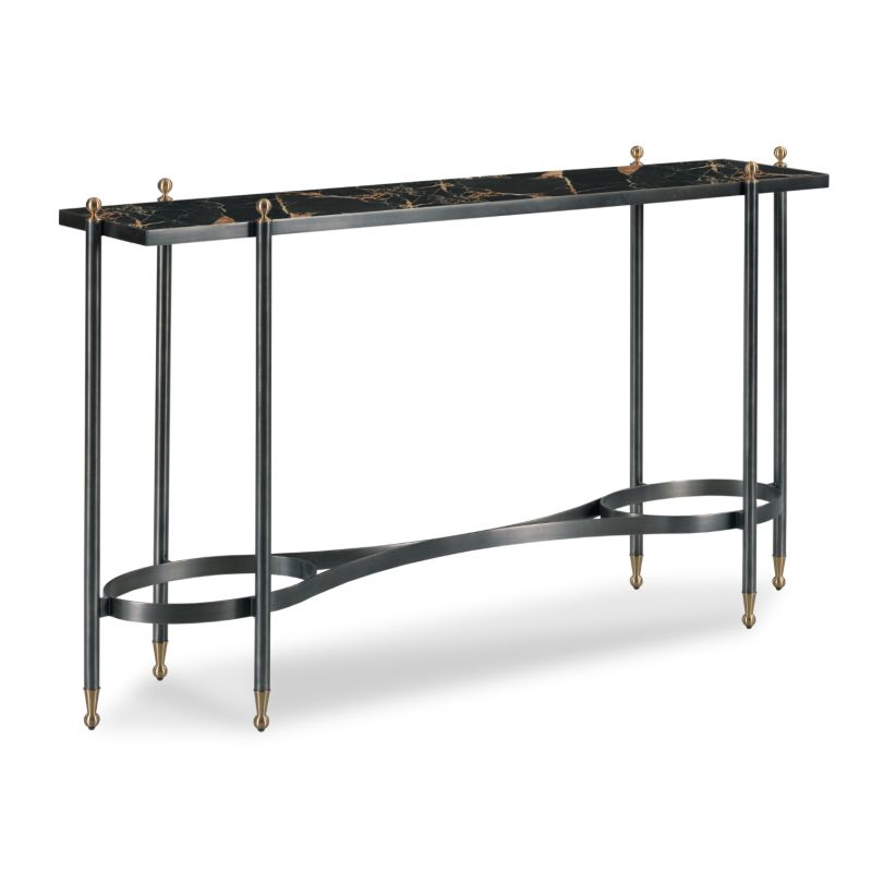 A lovely table adapted from mid 19th Century French garden furniture. Round metal posts crowned with brass finials support a rectangular inset stone top over a curvaceous and intricate metal stretcher.