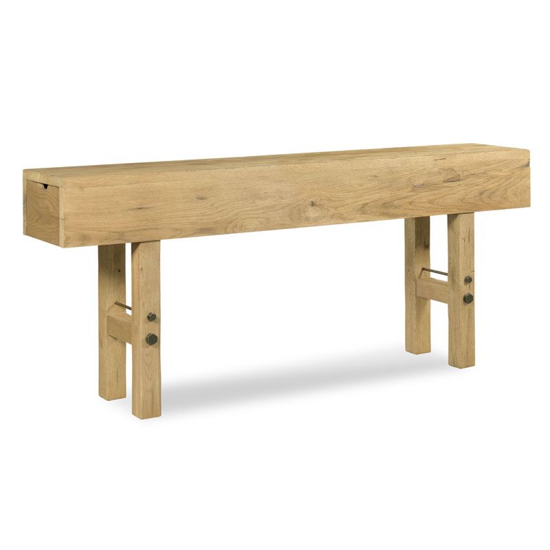 Inspired by a vintage industrial work table with a rectangular top elevated on squared posts that support two end storage drawers.