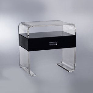 The Mandarin End Table is a compact, streamlined package. A single sheet of acrylic is stretched and bent around a lustrous black drawer box. Just like all of our products, this piece can be completely customized to fit whatever space you need.