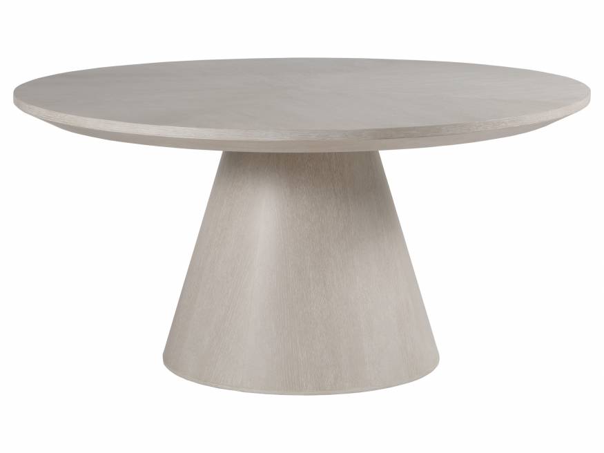 The 60-inch diameter dining table is a bold modern form that showcases radial matched grains on the veneered top to add interest and visual character above a 30-inch tapered base.