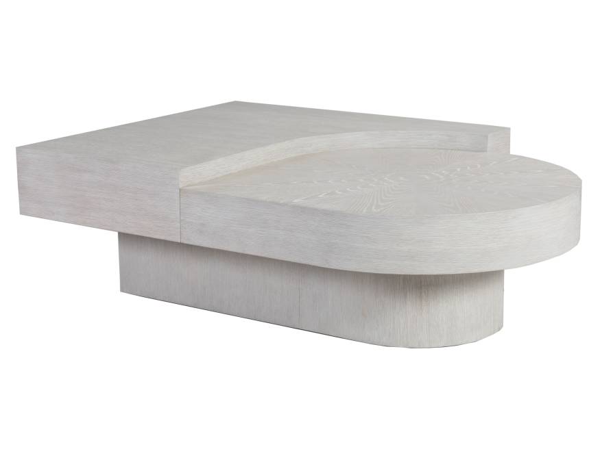 Bold modern forms crafted from select hardwoods and quartered white oak veneers in a misty white gray finish. The cocktail table is tiered with intersecting round linear shapes. The circular portion has a sunburst matched veneer pattern.