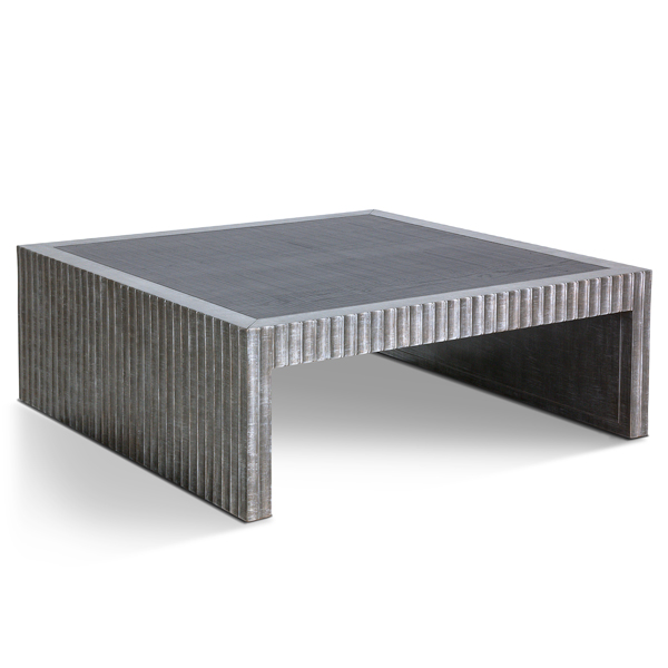 Width: 48” | Height: 18” | Depth: 48”Sculpted Wood Pattern: Lined UpFinish: Greyscape with Antique Pewter Veneer