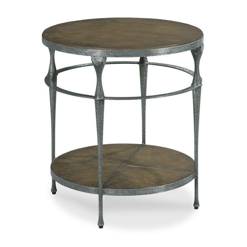 A handsome table with style hints from the metal work of French 18th century originals. Gracefully tapering metal corner posts are shaped from square to round joined by delicate metal stretchers below a round top veneered with flaky oak.