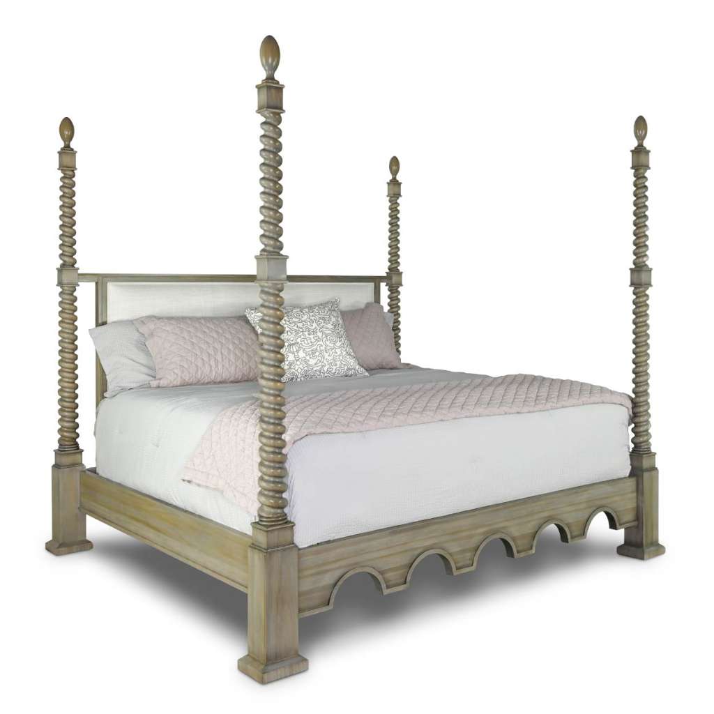 Headboard with Wrap Around Frame and Four Tall PostsPaint Finish: Grey BeachCOM: 3 yds railroad onlyOverall Width: 89" | Overall Height: 90" | Overall Length: 92"Frame Height: 11” | Siderail: 19"Headboard Height: 58" | Footboard Height: 16"Available in all OBD FinishesCustom sizes available