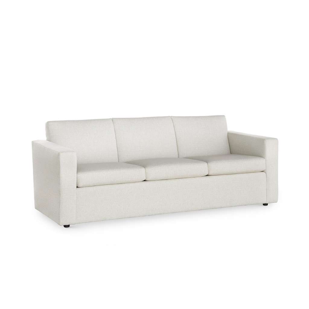 The 83-inch wide Nichols Sofa is made by hand in the USA using kiln-dried solid Maple with sinuous springs. It's squared cushions, arms, and back feel contemporary and classic. While shown in Kingston Warm White (Fabric No. 1430) fabric, you can choose from any of the upholstery options below.