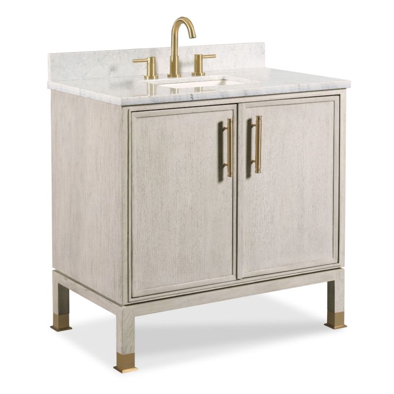 A wonderful cabinet paired with a Carrara marble rectangular top fitted with a rectangular ceramic sink and borings for your lavatory faucet selections. A pair of framed doors are elevated on sturdy squared legs that terminate to brass sabots. Cabinet has a removable access back panel: 14" W x 14.5" H for plumbing access.