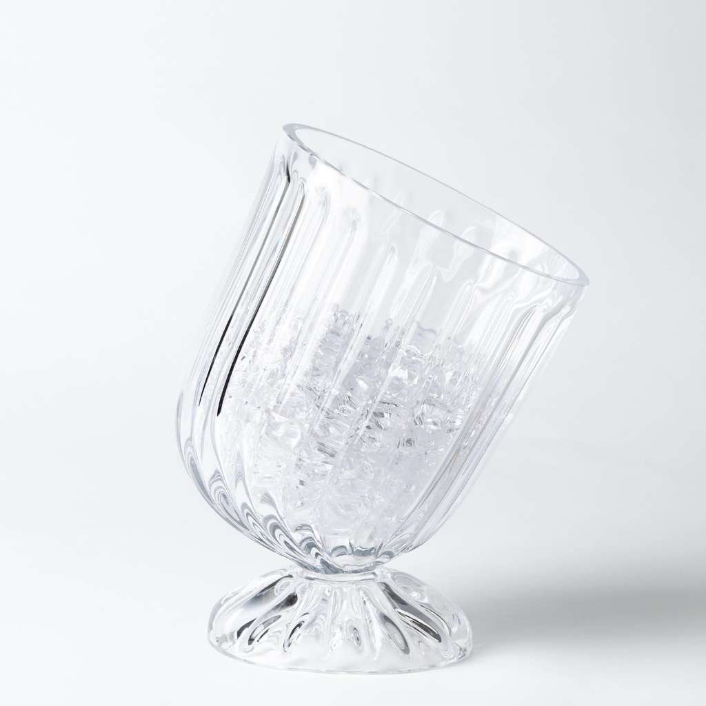 Your eyes do not deceive you! The unique tilt on the Optic Slanted wine chiller makes this piece perfect for entertaining with panache. Only slightly slanted, the chiller, made of Portuguese ribbed glass, sits perfectly on its attached base.