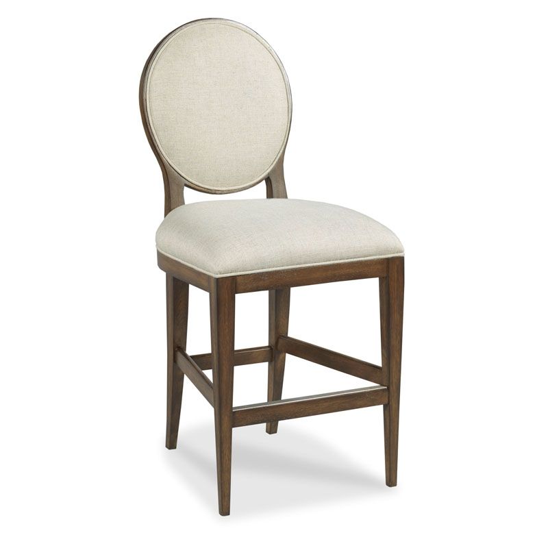A lovely oval back stool with styling derived from late 18th century French originals. The upholstered seat is raised on tapering legs below an upholstered back.