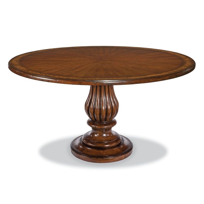 A pedestal table with handsome traditional styling has a molded round top above a robust multi-ringed carved column that rests on a round base.