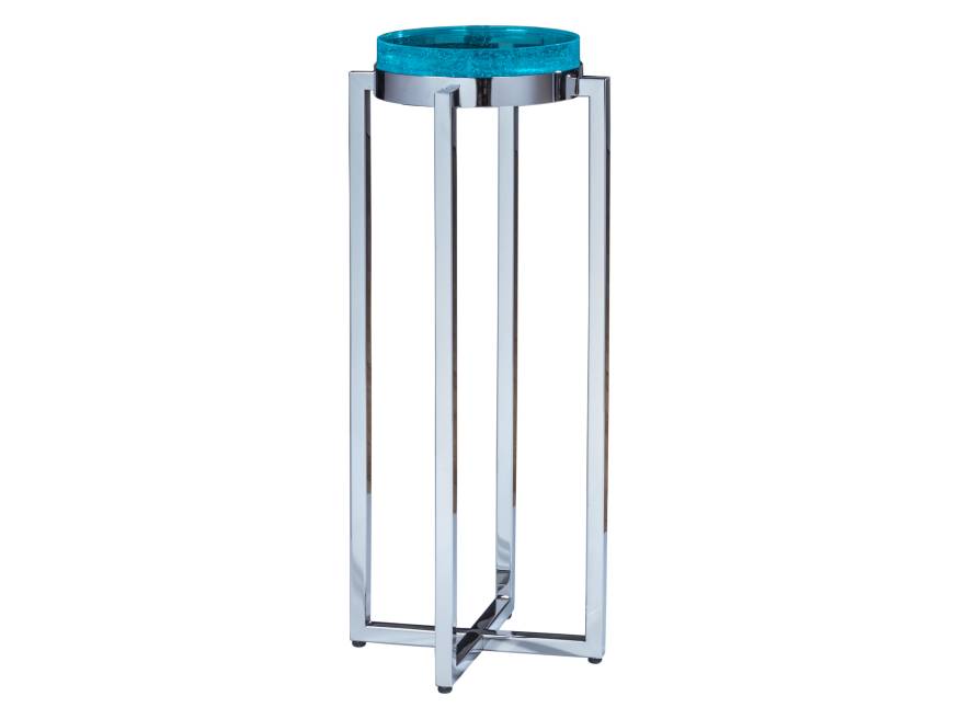 Modern stainless steel base featuring a stunning light sky blue bubble art glass top. Each art glass top is individually cast and will vary in appearance and coloration from piece to piece.