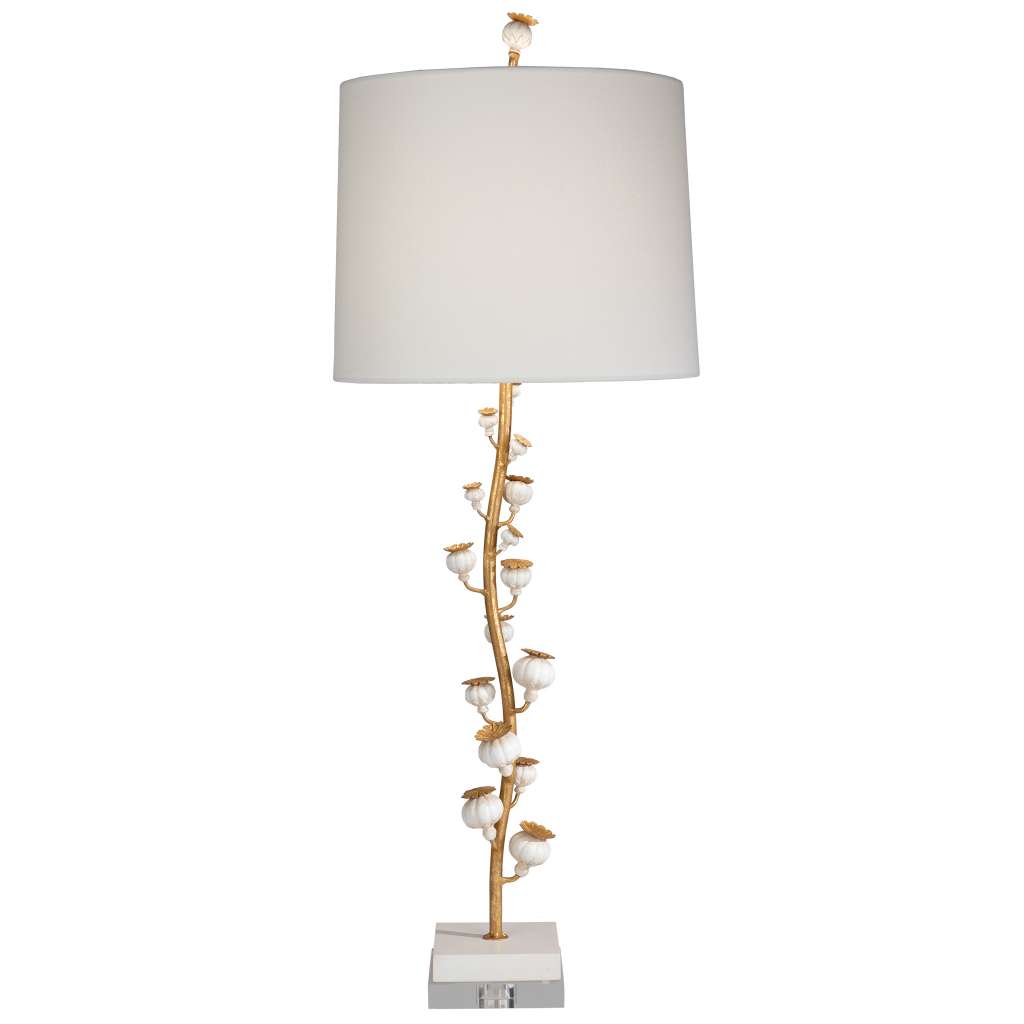 9112- POPPY FLORET ●Gold/White 38″H POPPY FLORET Shade Option: 89047 – 13x14x11″ Rnd Drum Sailcloth White 89046 – 13x14x11″ Rnd Drum Linen Oatmeal