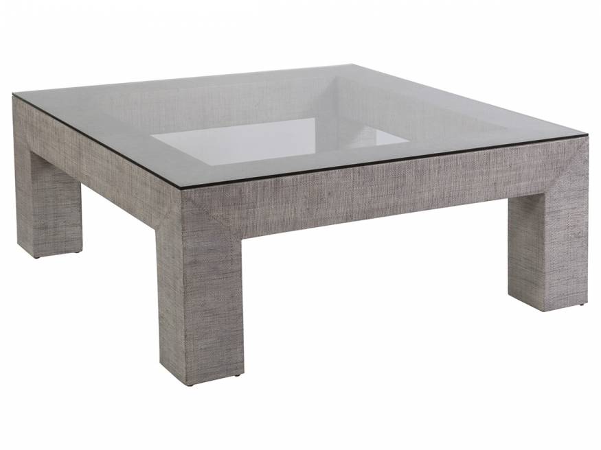 Veneered raffia base with mitered corners in a light gray coloration and a tempered glass top with flat polished edge.