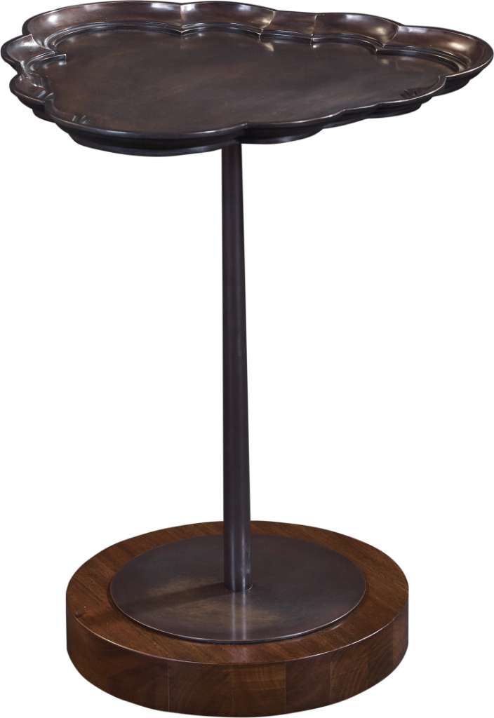 In the mid-1700s and again one hundred years later, the naturalistic ornament of the rococo style was fashionable in American homes. The inspiration for this Hickory Chair table is a 19th-century triangular-shape salver beneath an 18th-century copper teakettle and stand in the Blackwell Parlor at Winterthur Museum. The scalloped and lobed rim encloses low-relief designs of foliate scrolls, a diamond-and-star pattern, and asymmetrical cartouches, fancy enough for the teakettle to be displayed in a parlor even when not in use. The curvaceous top of the table echoes the outline of the teakettle salver. The result is a charming form. Oxford finish with Antique Bronze standard.