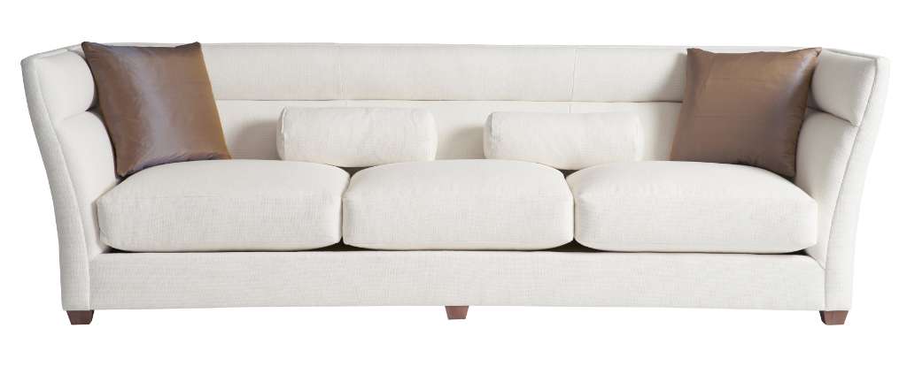 Soft and genteel, the curved Questa Sofa sits sculpturally and beautifully in a room. An integrated lumbar in the seatback provides unparalleled comfort and sits upon elegantly tapered legs. The Questa is also available with a beautiful kick-pleat skirt. Two 8 x 20-inch round bolsters and a pair of 22-inch goose feather throw pillows with hidden zipper standard. Spring-Down seat cushions standard. Standard weltless except around the base.