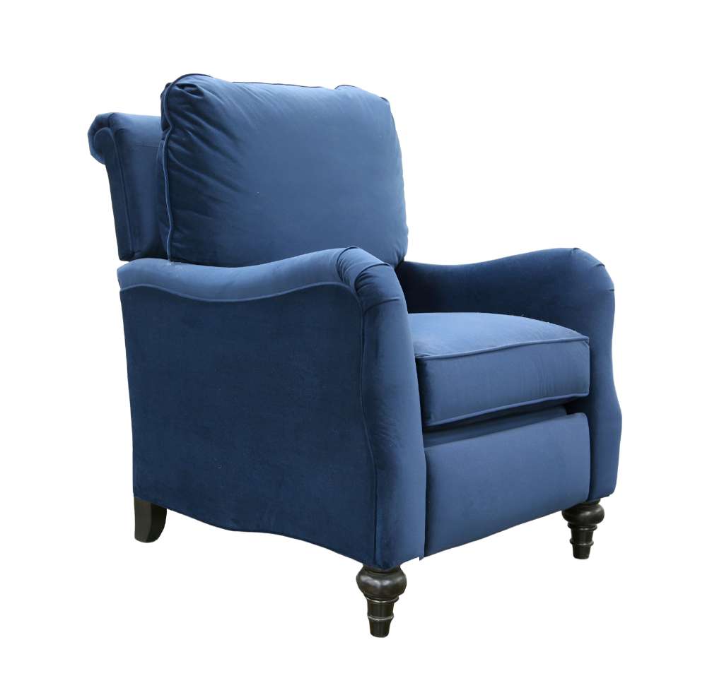 The Rachel Reclining Chair has English saddle arms, a rolled back, serpentine side rails, a loose pillow Blend-Down back, a Spring-Down seat cushion and hand turned legs. The Rachel features a push back mechanism that allows the back to angle while raising the foot rest. It reclines in two positions. When fully reclined with the footrest, the overall depth is 66 inches. To fully recline, the chair must be 22 inches from the wall.