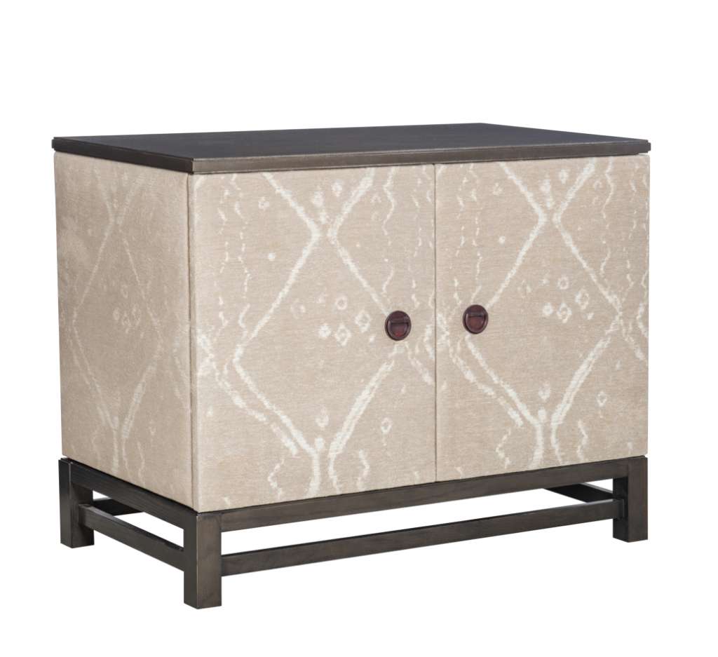 The Remy Upholstered Cabinet Series was interpreted from a Japanese 18th Century Tansu. Choose a single Upholstered Two Door Cabinet (shown) or Upholstered Three Door Chest to sit on the Remy Wood Base. The door chest and three drawer chest are designed to stack to create your own configuration. Select from a group of fabrics, your choice of finish and choice of nail. Standard with Antique Bronze hardware and NS-08 nail head trim. One adjustable shelf is standard. Shown with HC9571-70 Remy Stand.