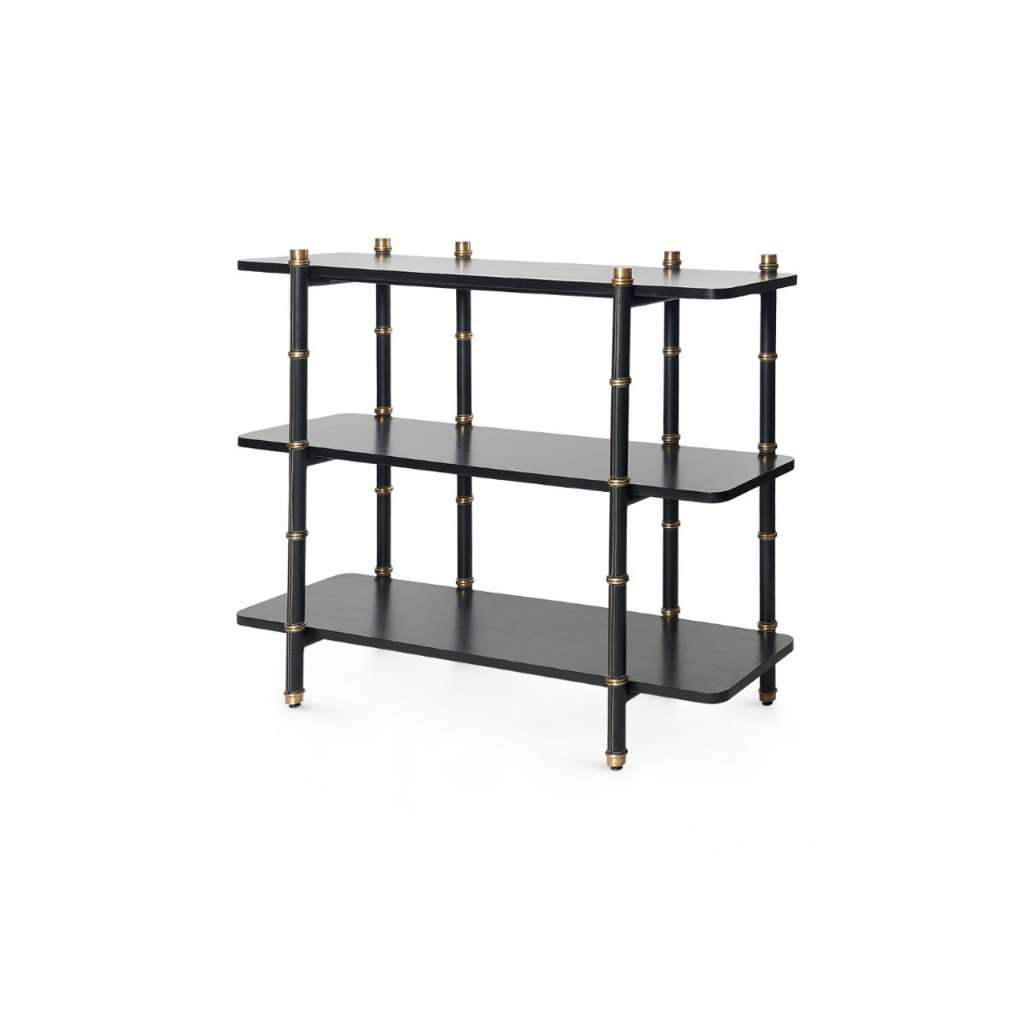 The Reneau Collection is a captivating reinterpretation of modern French furniture. Featuring three tiers of elegant shelving, this piece is a testament to refined craftsmanship. The corner posts are fully wrapped in leather with contrast stitching and accented by rings of antique brass to create a captivating visual appeal that mimics bamboo. The sleek lacquered shelves feature gracefully rounded edges and offer both style and durability. With its versatile charm, the Reneau Low Shelf effortlessly enhances any room, from offices to dining rooms to living spaces.