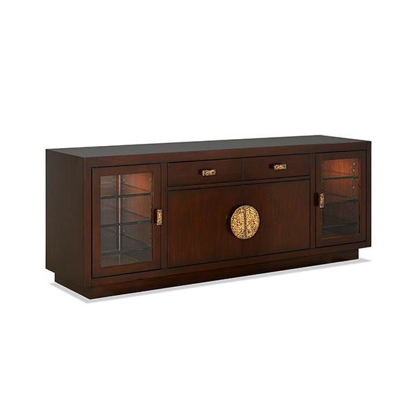 Finish: RosewoodDistress Level: LightHardware: John Kobe Small 7" Door Pulls & Baker Knob in Gold w/ Black GlazeInterior Lights, & Adjustable Glass Shelves
