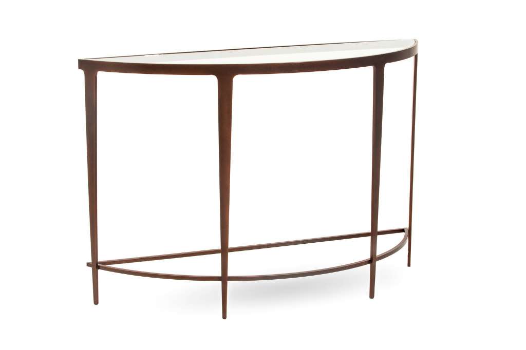 Our Roundabout Console has a slender demi-lune Glass top that is elegantly supported by sleek tapered legs that match well with our Ellipse collection.
