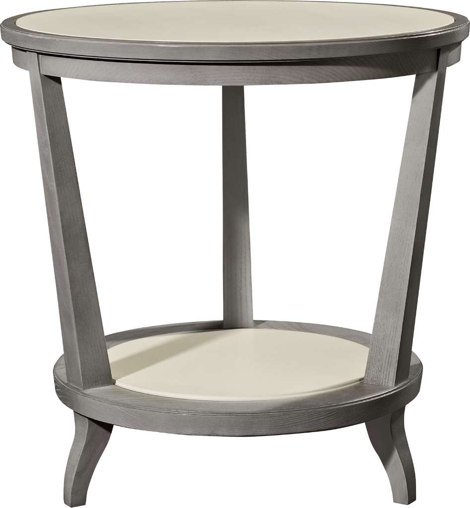 The Rye Round Side Table has a graphic, architectural form with angular tapered legs and a lower shelf with serpentine feet below. The Rye Round Side Table is available in your choice of quartered ash (186-10) or quartered mahogany (186-11) as COV®, this versatile round side table lends itself to personalization through countless finish combinations and optional hand-striping possibilities. . Optional combination of Weathered Mineral and Antique Ivory paint as shown.