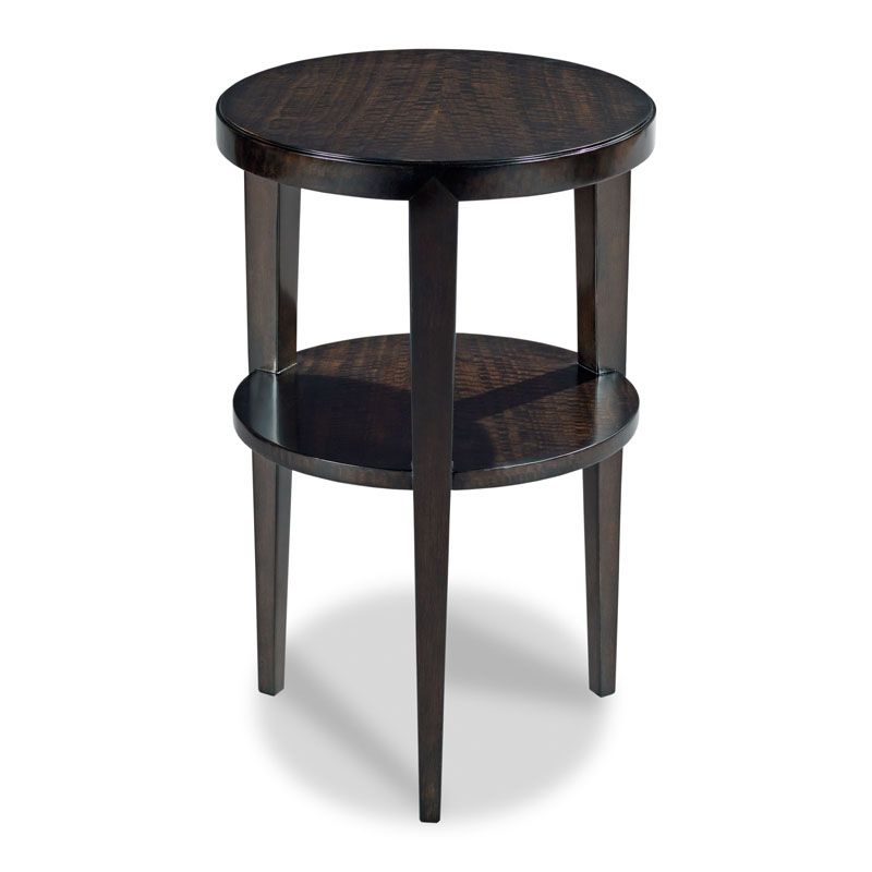 Sleek metropolitan styling is evident with this fine table for drinks. A round top is veneered with rich figured Mozambique veneer over three gracefully tapering legs that are joined by a mid shelf.
