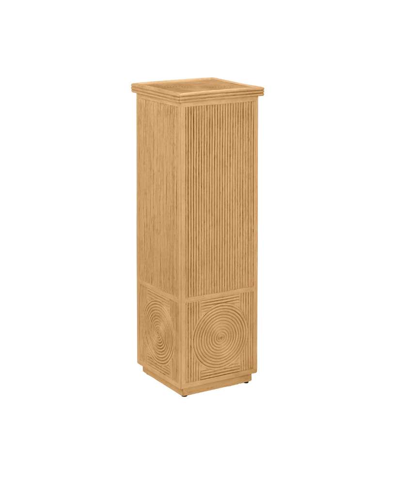 The Santos Sea Sand Pedestal has a split rattan pattern on each of its four sides and on the top, the pieces applied by hand to a solid mahogany substrate. Then a sea sand finish is applied to the entire piece. A design detail of note is how the layered circular patterns are added only at the bottom of each of its four sides to create interest. This tan pedestal was designed by Aimee Kurzner.