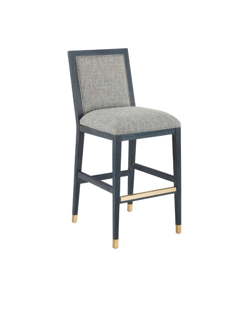 The Santos Vintage Navy Bar Stool has a split rattan pattern on the back, which is made by hand and applied to a solid mahogany frame. Once the natural material is in place, a vintage navy finish covers the back, frame, and legs. The blue bar stool is upholstered in a Barrett Dusk material. The stool has brass ferrules with a capped step to add sophistication to the overall design.