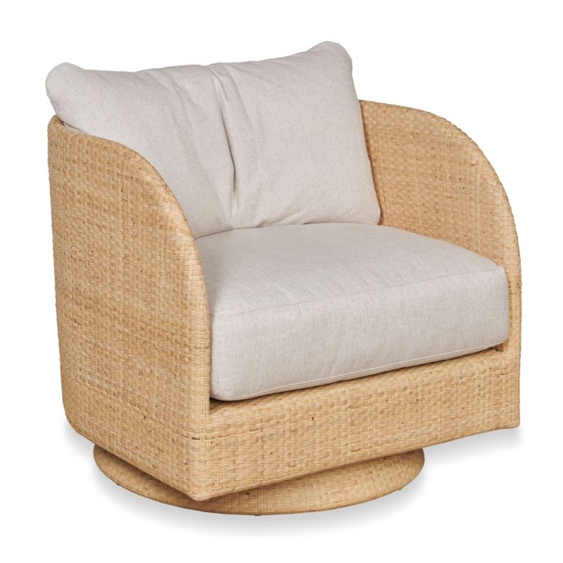 A wonderful lounge chair with a barrel back design crafted from natural rattan that is fitted with a loose cushioned back over an ample upholstered seat cushion over a swivel base.