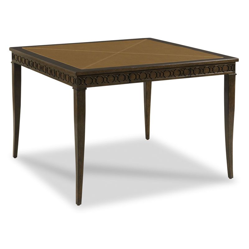 A framed square top inset with Pindler Bukaroo Buckskin over apron rails that feature a pierced fretwork fitted with game piece drawers on each side. The table is raised on squared posts that terminate to stylized cabriole feet.
