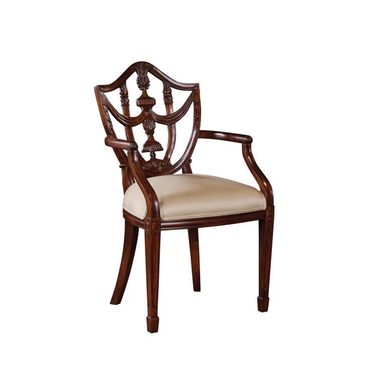 W 23 D 21 H 39 Carved Polished Mahogany Hepplewhite Shield Back Arm Chair, Neutral Fabric Upholstery In Stock Buy Now