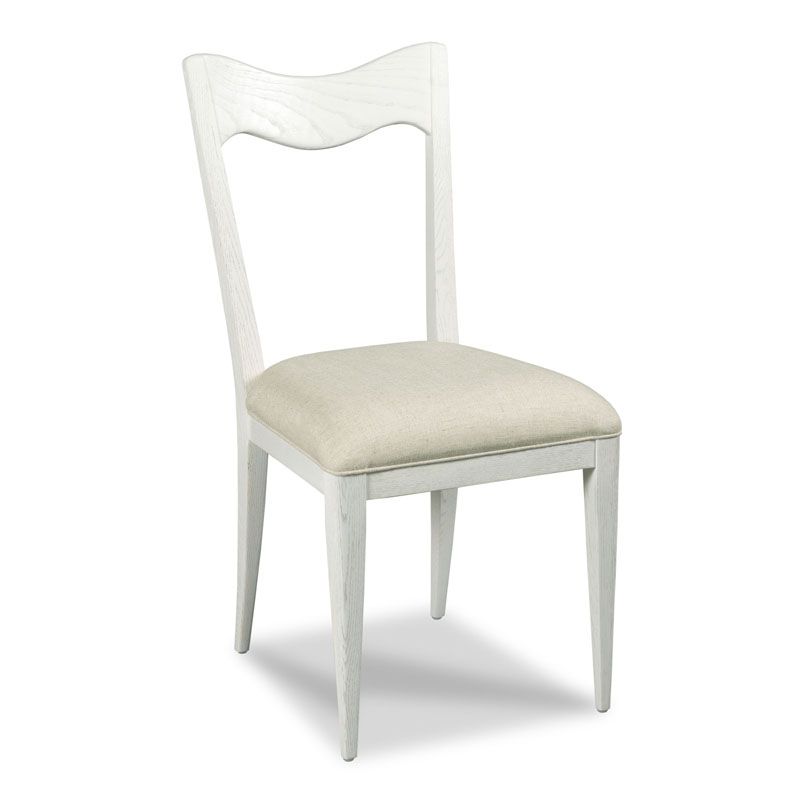 A graceful chair design that was adapted from a mid 1950’s Italian original. A descending curved crest rail is flanked by tapering corner posts that elevate an upholstered seat.