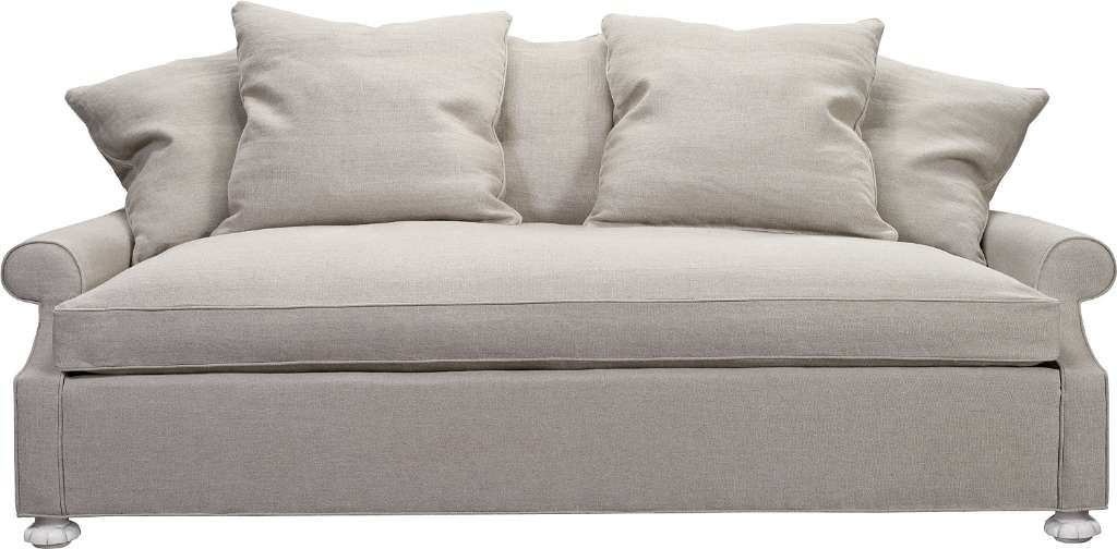 From the endless possibilities available through the Silhouettes Upholstery program, this Sofa features Serpentine Arms, a Multi-Pillow Knife Edge Back, Exposed Leg number 331 finished in Heritage White without the contrasting decoration and was made Extended Height and Standard Depth. As an option, a 25/75 down one-piece seat cushion was added. The ferrule caster on the 530 maple turned leg is available in antique brass (default) or satin nickel (optional for no up charge).