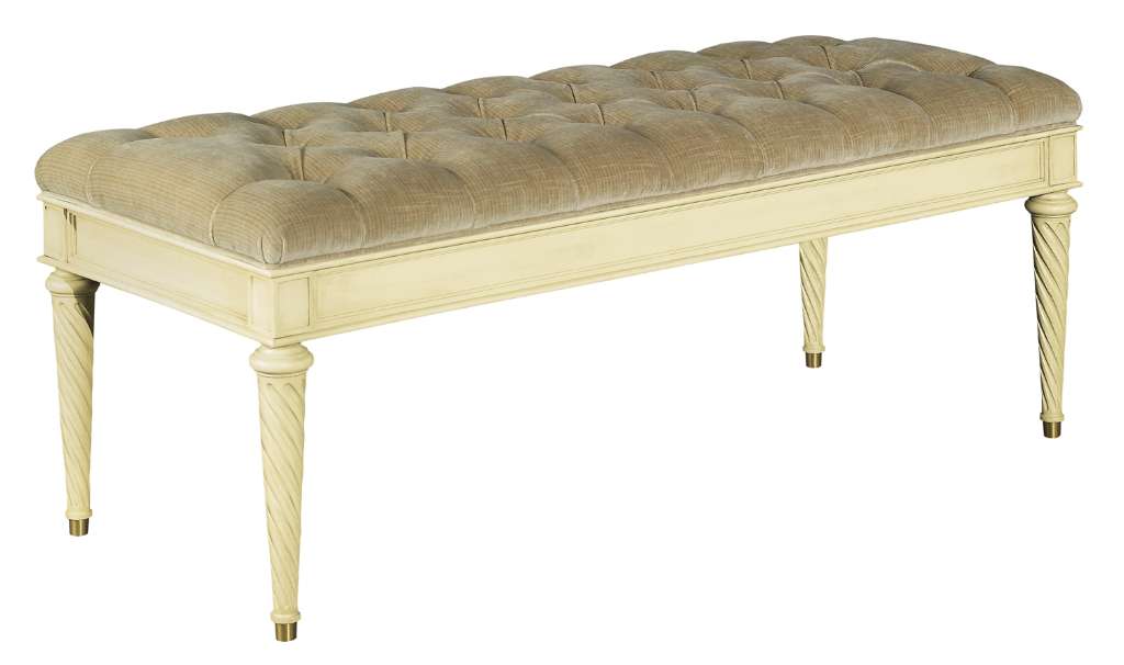 The Simon Bench has spiral carved legs that terminate with antique brass ferrules. Standard with a tufted top, It is available with an untufted version as well. Chippy White paint shown.
