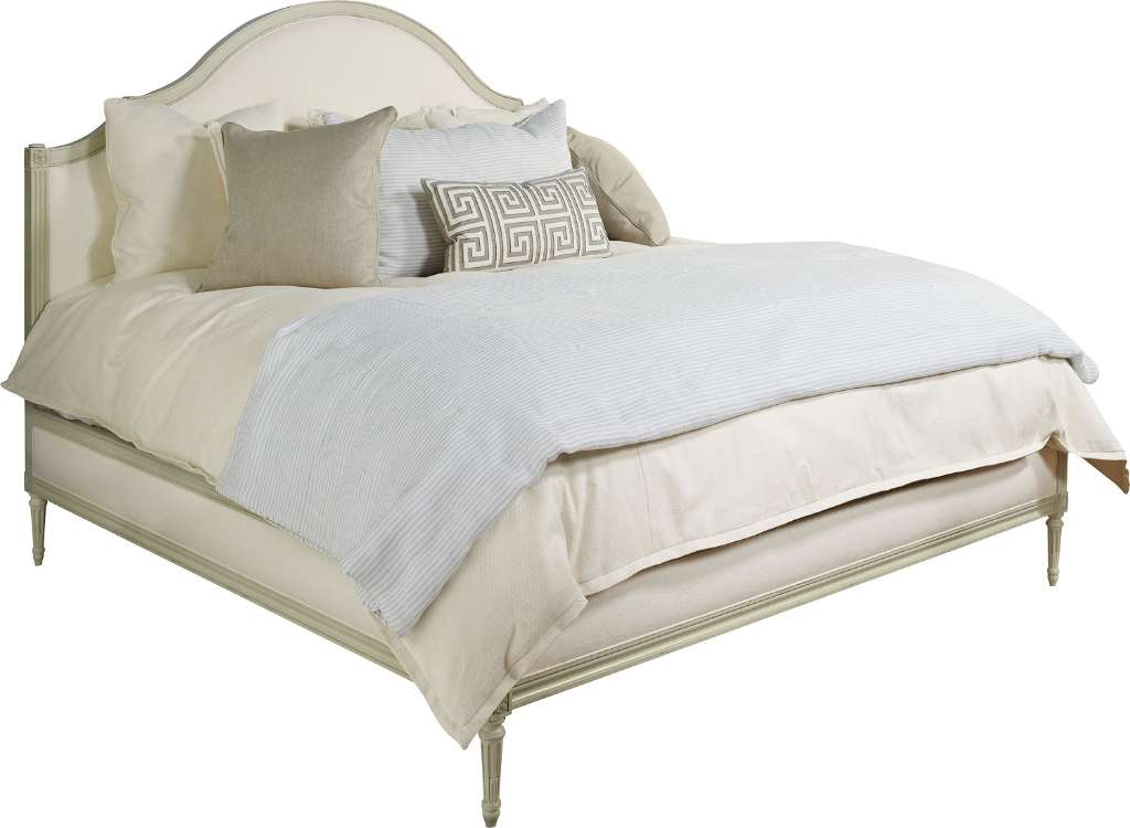The gracefully curved top rail of the Simone headboard draws inspiration from the bonnet of an antique French secretary’s deck. Finely hand-carved rosettes and fluting embellish its solid mahogany frame, which features an upholstered panel headboard, along with matching side and foot rails. For a personalized touch, choose between a delicately carved finial or a flat cap for the headboard and footboard posts at no additional charge. Available in Twin, Queen, and King sizes, Simone is also offered as a headboard-only option.