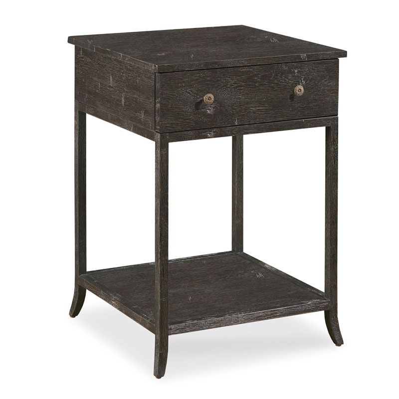 Inspired by 19th century European styles. Subtle refined details create elegance to this handy table with a square oak top resting over an ample storage drawer elevated gracefully on squared corner posts that terminate to an elegant flare. The legs are joined by a low shelf for display.
