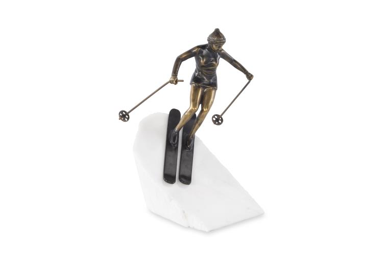 W 9.25 D 7.75 H 9.5 Cast brass skier sculpture with a white marble base. Out of Stock