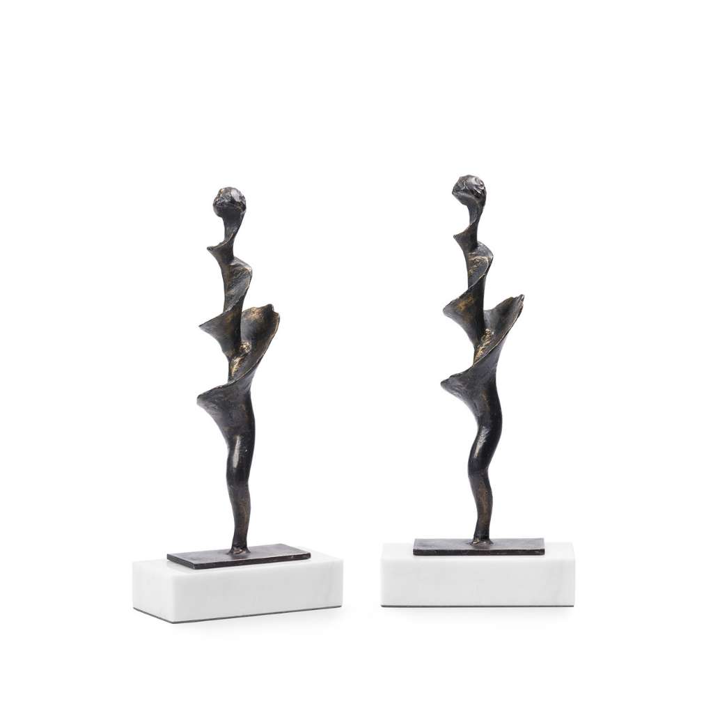 These abstract bronze-finished iron statues are influenced by the natural elements of the ocean. Our artisans sand-cast each piece giving the Spiral Statue an earthy texture and the  shape of an eroded conch shell on the shore. A beautiful organic form that disappears over time but is rendered in a durable material to take on a more substantial presence. Its white marble base makes it perfect for display on your bookshelf, console, or in your home office. Sold in a set of 2, these statues will balance any living space gracefully.