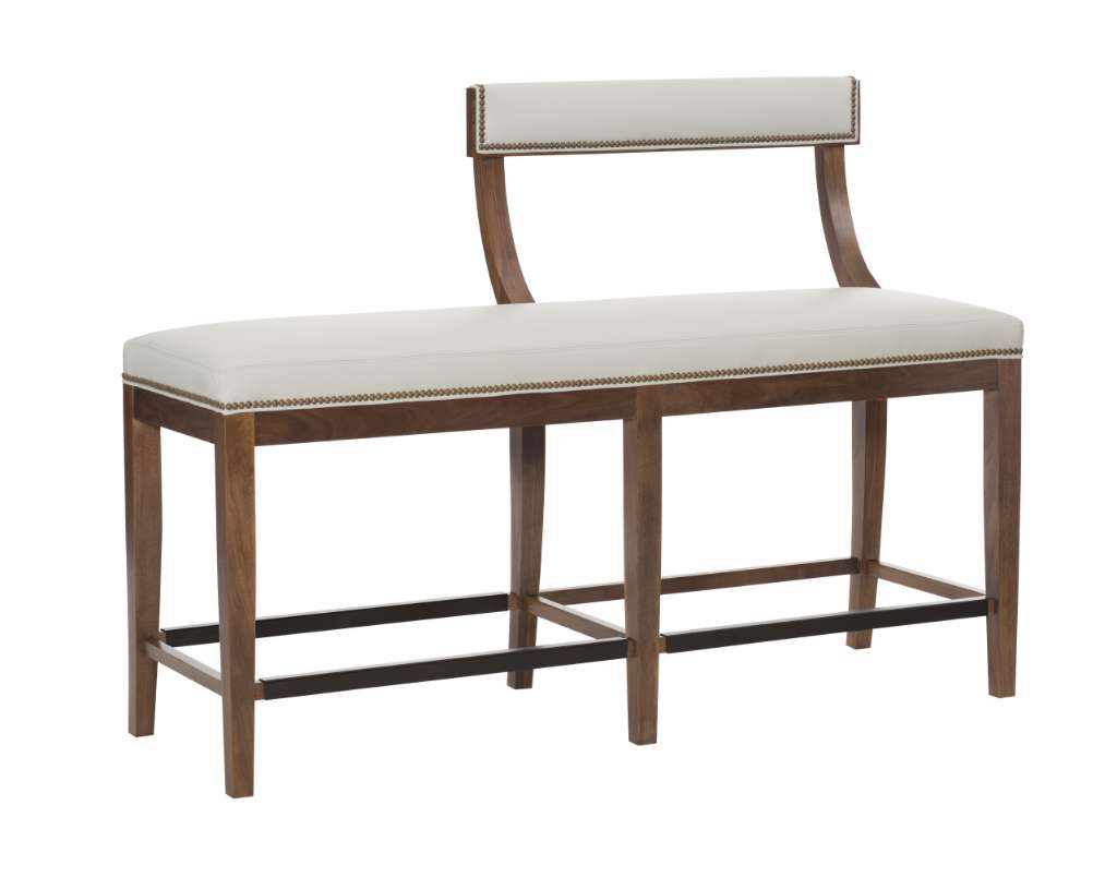 This bench encourages conversation coming and going at any counter. Sit forwards or backwards in comfort or simply marvel at its asymmetrical and unique form. Welt trim standard. Saddle stitch with welt standard in leather. Shown in Truffle finish with Browned Steel finish on stretcher guards.
