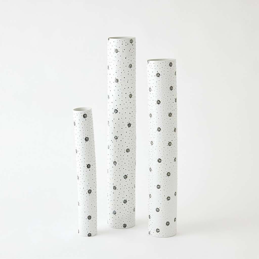 Crafted from slip-molded Portuguese porcelain, the Spotted Tube Vases showcase a textured design embellished with hand-painted black spot details.