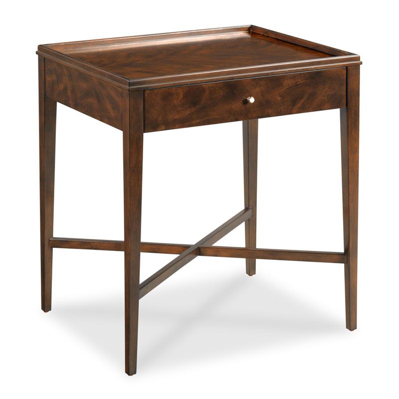 An elegant table with a galleried rectangular top over an apron rail drawer raised on graceful tapering legs joined by a low "X" stretcher.