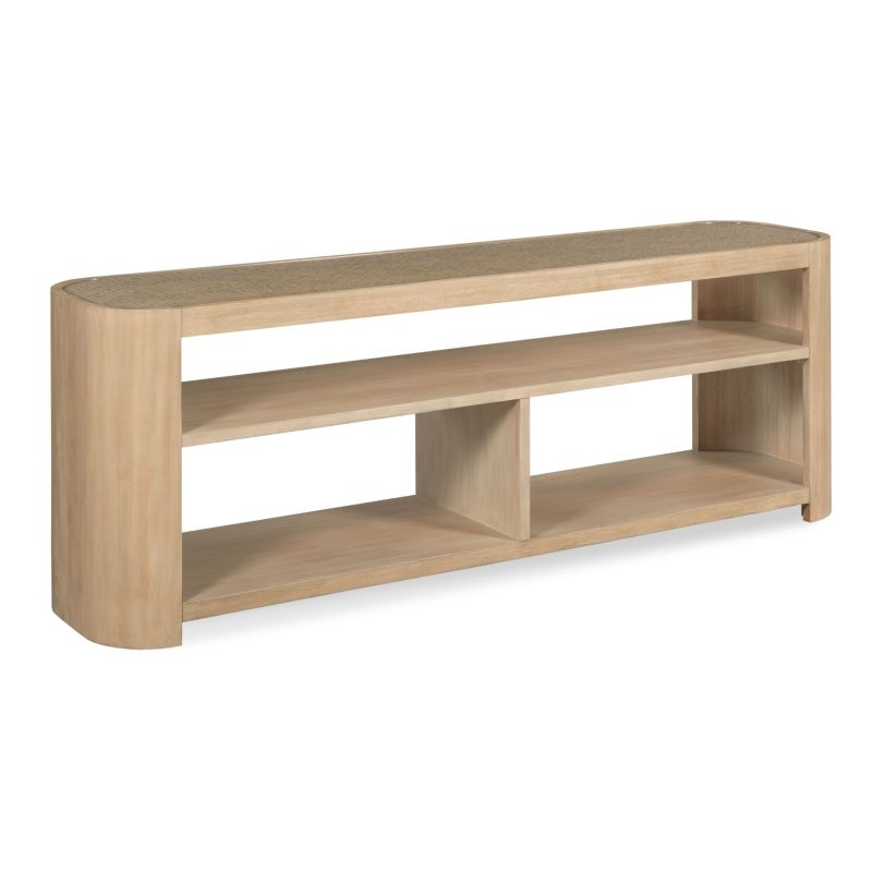 Clean lines and minimalism define this wonderful table for media or a variety of needs. The inset glass top is fitted above a woven rattan field elevated on rounded corner legs that are joined by a myriad of shelves for electronic components or display.