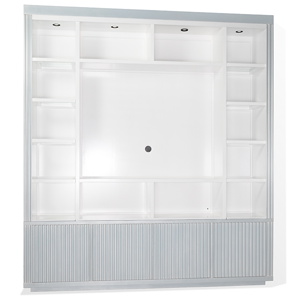 Body Finish: Silver MoonInterior Finish: Stark WhiteSculpted Wood Pattern: FlutedTouch Latch DoorsWidth: 108” | Height: 120” | Depth: 20” | Center Opening: 62" Wide Available in all OBD FinishesCustom sizes available