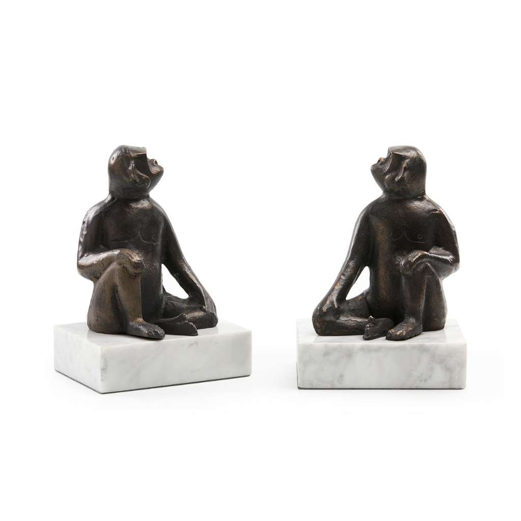 The Tamarin Bookends are a fun and playful decor set featuring pensive tamarin monkeys. Available in both bronze and gold leaf finishes, each monkey sits atop a white marble base, creating a striking contrast. These charming bookends add a whimsical touch to any shelf or desk, making them both functional and decorative. Perfect for adding personality to your home or office.