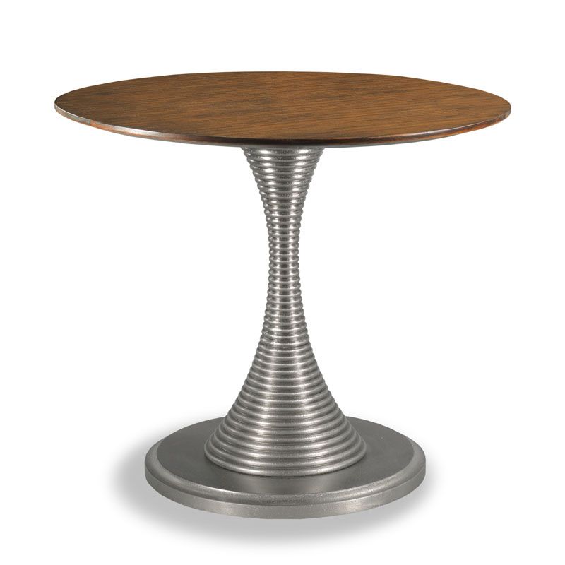 The highlight of this table is the base, designed in the tulip style and featuring a textured ringed metal base with a round hand planed top.