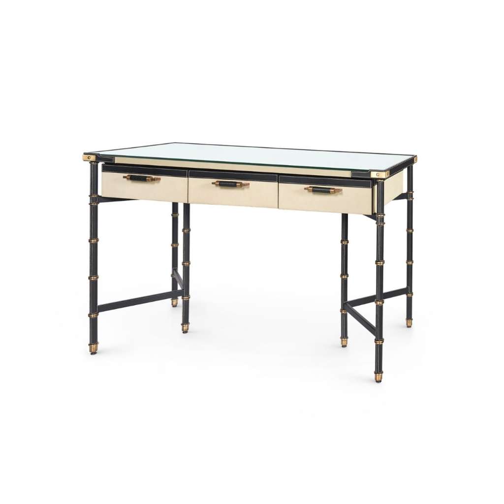 The Toulon Desk is a true statement piece for any space. With its leather wrapped frame and canvas drawers, it offers a unique blend of elegance and creativity. The included tempered-glass top adds a practical modern touch, while the leather accents boast contrast stitching and antique brass rings, reference a French campaign style sophistication. Complete with laced pulls, this desk is as stylish as it is functional.