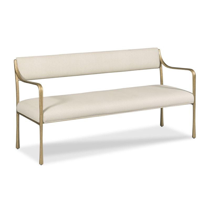 A graceful glamorous bench with an upholstered seat and back are elevated on a cast aluminum frame. The frame highlights curves in the arms and a slight flare at the base.