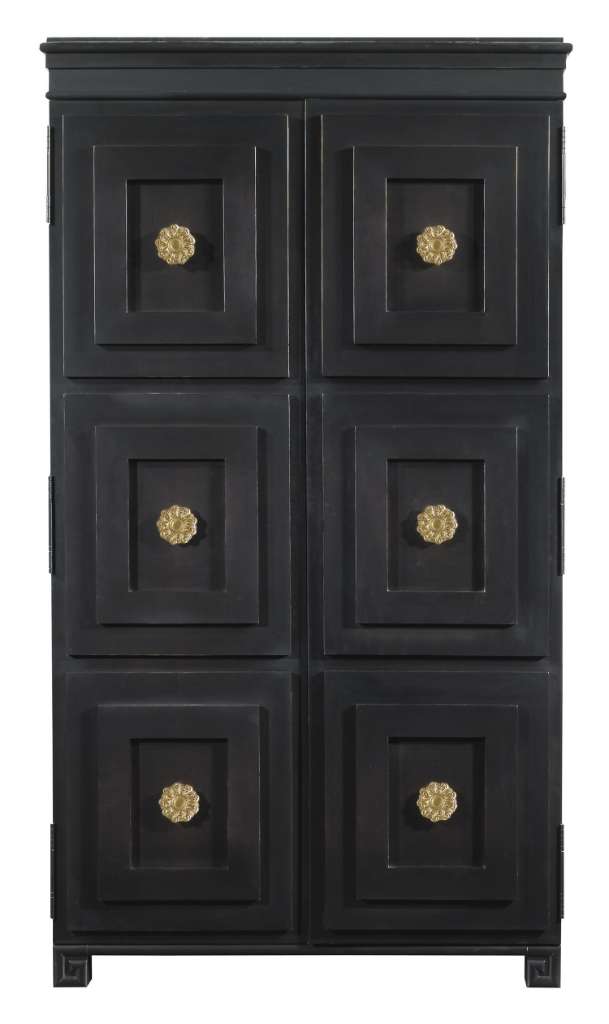 The Tuxedo Tall Cabinet was inspired by a vintage 1940's French Modern cabinet in Suzanne Kasler's home. The cabinet features 6 interior drawers with 2 Golden Brass knobs per drawer, 2 adjustable shelves in the upper opening with a clothes rod installed above the shelves. The exterior doors can accept Customers Own Hardware (COH). The Rosette hardware shown is in Golden Brass; Silver Rosette hardware is also available. A companion 2-door chest and a 3-door sideboard are also available.