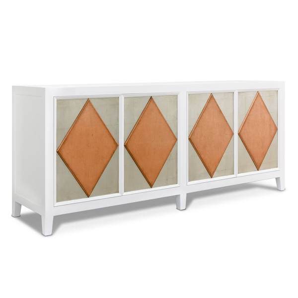 Finish: Stark WhiteDoors: Warm Silver LeafWith Copper Leaf DiamondsWidth: 84” | Height: 36” | Depth: 22”