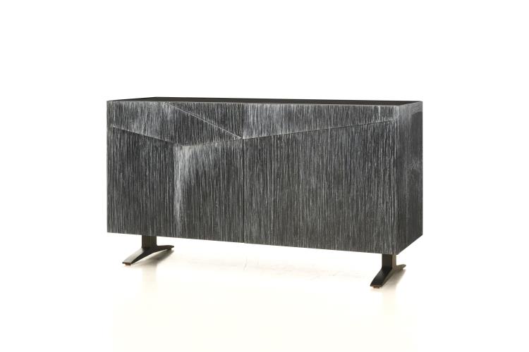 W 56 D 20 H 35 Navy blue sideboard featuring a drip paint lacquer finish, smoked black glass top, and dark bronze brushed legs. Two interior shelves. Wire management included. In Stock Buy Now