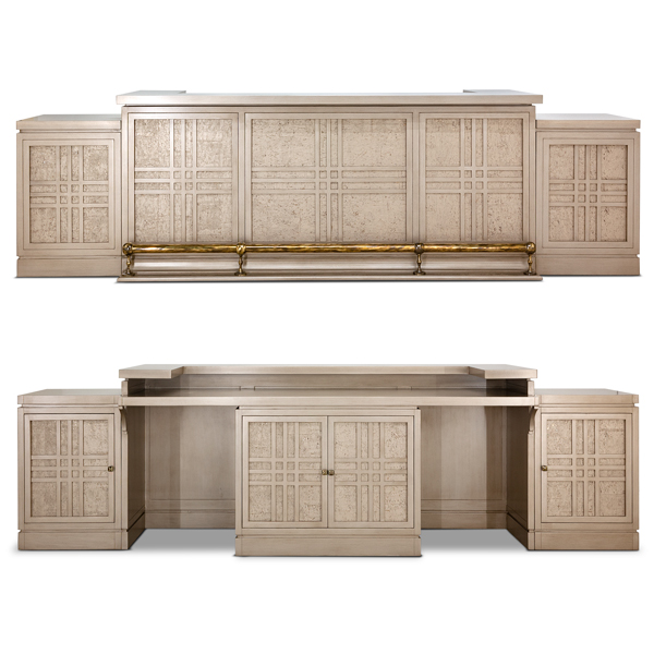 Wood Finish: ProseccoWallpaper Panels: OBD Thibaut Cork ChampagneCOW: 11 ydsHardware: Walsh Knobs in Antique BrassWidth: 144” | Height: 42” | Depth: 35”